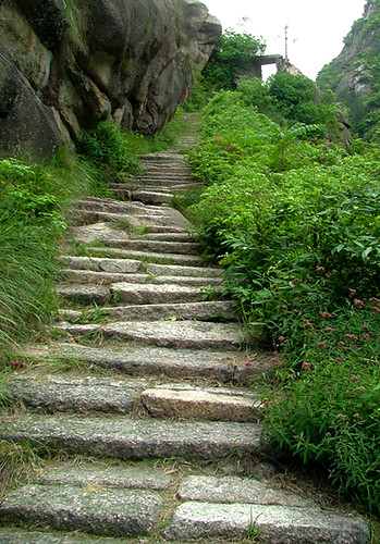 整块石头铺成狭窄的石道,右边就是陡峭的石壁。